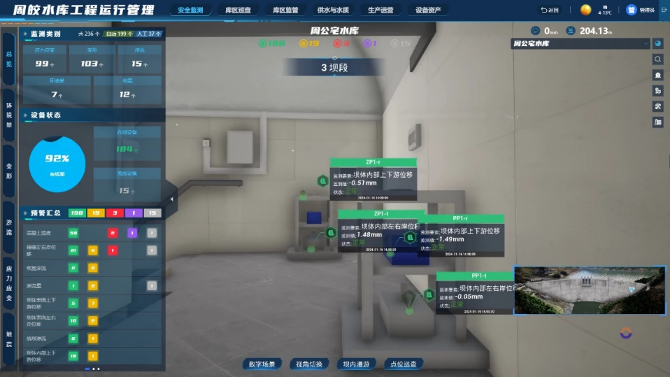 水庫大壩是流域防洪工程體系重要組成部分,是保障水安全的“重器”。數(shù)字孿生周公宅-皎口梯級水庫系統(tǒng)利用高精度模擬仿真引擎1:1構(gòu)建水庫大壩可視化模型和工程安全監(jiān)測分析模型,全面監(jiān)控、深入分析水庫環(huán)境量、變形、滲流、應(yīng)力應(yīng)變、地震等安全要素,逐時分析大壩的各項安全指標(biāo),直觀展示大壩的安全狀態(tài)。