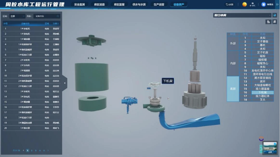 依托BIM仿真建模技術(shù),數(shù)字孿生周公宅-皎口梯級水庫系統(tǒng)實現(xiàn)了對水庫重要設(shè)備資產(chǎn)的精細(xì)管理。結(jié)合監(jiān)測監(jiān)控數(shù)據(jù),實時掌握水庫防洪、供水、發(fā)電的運(yùn)行狀況,保障水庫安全高效運(yùn)行。同時,利用BIM技術(shù)對水輪機(jī)、發(fā)電機(jī)等重要機(jī)電設(shè)備進(jìn)行零部件級的拆解,“再現(xiàn)”設(shè)備的內(nèi)部機(jī)構(gòu)和狀態(tài)。這一技術(shù)幫助水庫工作人員直觀、深入地了解設(shè)備的運(yùn)行原理與機(jī)制,為設(shè)備的精細(xì)管理及維修養(yǎng)護(hù)提供重要支持,也大幅提升了水庫設(shè)備管理的智能化水平。