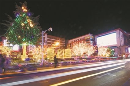 火樹(shù)銀花不夜天,流光溢彩呈繽紛。“今年的夜景真漂亮??!”旺姆阿姨和登增叔叔晚飯后帶著孫女來(lái)到將軍橋散步,在自己的家鄉(xiāng)欣賞到如此美妙的景色,登增叔叔忍不住夸贊。此時(shí),將軍橋道路兩旁的綠化帶在彩燈的映襯下輪廓畢現(xiàn),與玻璃棧道上的光影交相輝映,城市美景盡在其中。