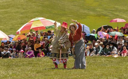 據(jù)說早在吐蕃時(shí)期,人們以村寨為單位,在本教僧人的帶領(lǐng)下高舉幡桿,手拿青棵、麥穗,繞田間地頭轉(zhuǎn)圈,祈禱神靈保佑,獲得豐收。儀式結(jié)束后,就在草場(chǎng)上展開角斗、斗劍、耍梭標(biāo)等活動(dòng)。格魯派興起后,這一活動(dòng)仍得到保留,只是在繞地巡游時(shí),人們要舉佛像、背經(jīng)文,文體活動(dòng)也增加了賽馬、射箭、馬術(shù)、藏戲、民間歌舞等內(nèi)容。解放后,革去了繞地巡游等一些宗教儀軌,增加了許多休閑娛樂、物資交流的內(nèi)容?!巴?jié)”沒有固定日期,各地根據(jù)農(nóng)事而定,一般在秋收前(8月)擇吉日舉行,時(shí)間1-3天。