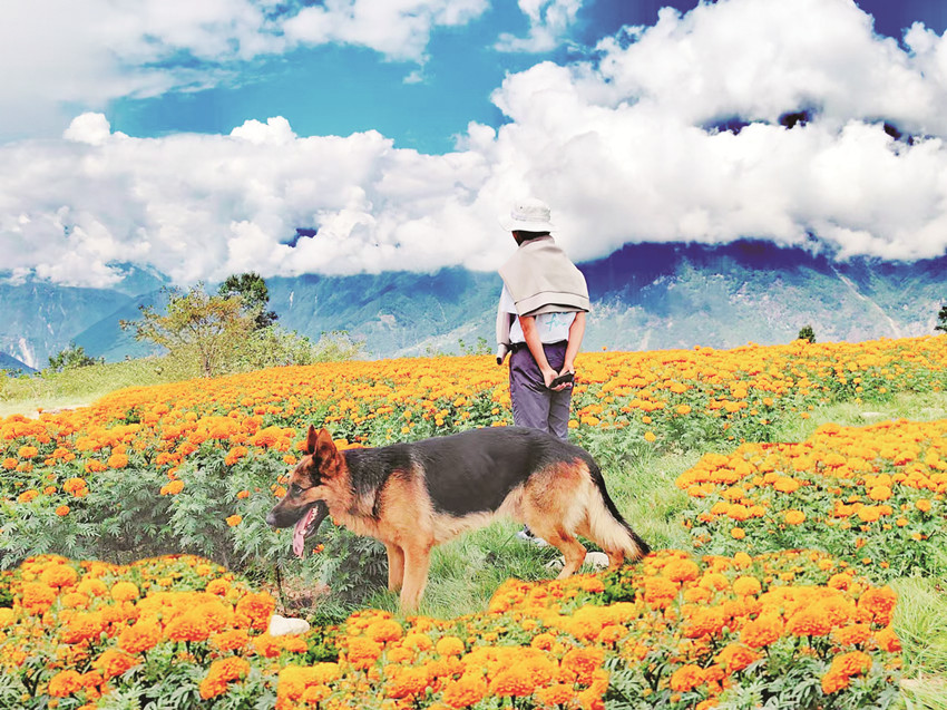 在這金風送爽的秋日,瀘定德威加郡海子村18萬株萬壽菊競相綻放,漫步在花海之中,人們可以感受秋風的輕撫,呼吸清新的空氣,寧靜的村寨依托著貢嘎雪山、藍天白云,在成片的萬壽菊裝點下構成了一幅亮麗的鄉(xiāng)村畫卷。