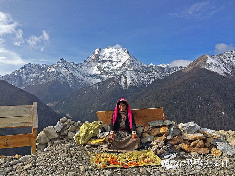 那姆說的那一座打敗她的雪山是仙乃日,亞丁的三座雪山之一,其他兩座是夏諾多吉和央邁勇。我們在仙乃日的觀景臺拍照,一個藏族婦人端坐在埡口,來來往往的游客把她和雪山的背景攝入鏡頭。有個亞丁鎮(zhèn)的人搭乘了我們的大巴,他站在埡口,從衣服里拿出一疊風馬旗,朝天空揮灑,五顏六色紛紛揚揚。在藏區(qū),神山的埡口,經常能夠看到揮灑風馬旗的人,祝福長路,愿你一路平安。