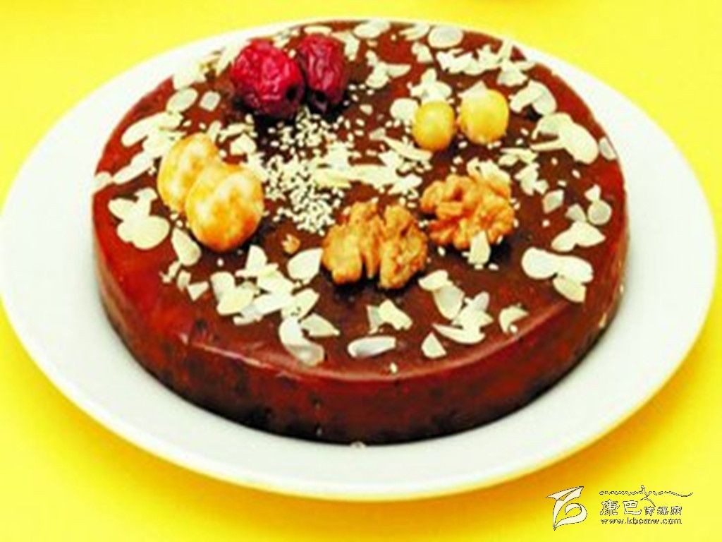 八寶年糕 原料 糯米1000克,白糖、麻仁青梅、葡萄干、瓜條、白蓮、桃脯、豬油各20克。 做法 先將糯米淘洗干凈,水浸24小時后上蒸籠蒸爛,取出用木棒搗爛攤涼,把白糖等搓勻成餡,在方盤內刷豬油,鋪上搗爛的1厘米厚的糯米飯,每鋪一層放入適量的餡,共鋪3層,蒸熟后用刀切為小塊即成。 夾心年糕 原料 糯米1000克,青紅絲、小豆、白糖各50克。 做法 將糯米洗凈浸泡24小時后上蒸籠蒸爛,取出用木棒搗爛后展切成2塊,把小豆煮爛加糖再加青紅絲做成餡撒于其中一塊上,再將另一塊放在餡上壓實壓緊,用刀切成塊即可。