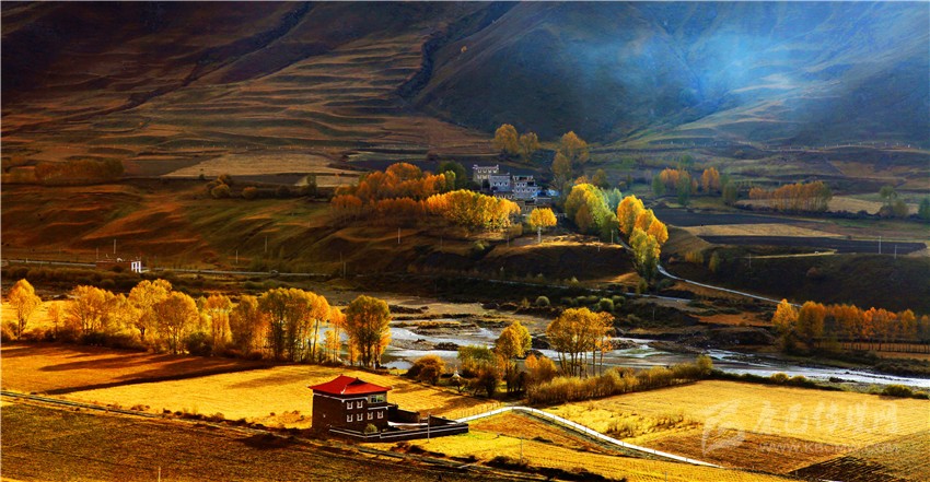 沿著公路行駛,您會(huì)看到公路兩邊的青稞都已金燦燦,綠葉變黃,溪水靜靜流淌,小樓上的經(jīng)幡隨風(fēng)舞動(dòng),白塔依稀林立,陽(yáng)光照耀下的東路各縣市的空氣中充收獲的氣息。 藍(lán)天白云,小橋流水,金黃色的白楊樹,精美的藏式小樓,在光與影的映射下,仿若一幅油畫,等待您的發(fā)現(xiàn)和欣賞。