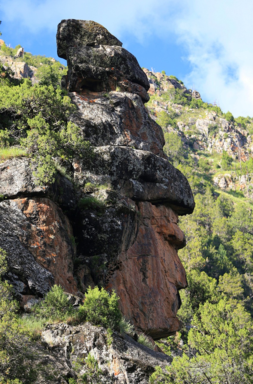 從多爾家溝口走7公里到日貢多時(shí),在右側(cè)的山巖上發(fā)現(xiàn)了一處自然形成的人頭像。耳、眉、眼、口、鼻五官形象逼真,還穿戴著帽子和盔甲,第一眼看見就不禁聯(lián)想到格薩爾藏戲面具和格薩爾石刻中的格薩爾王形象。
