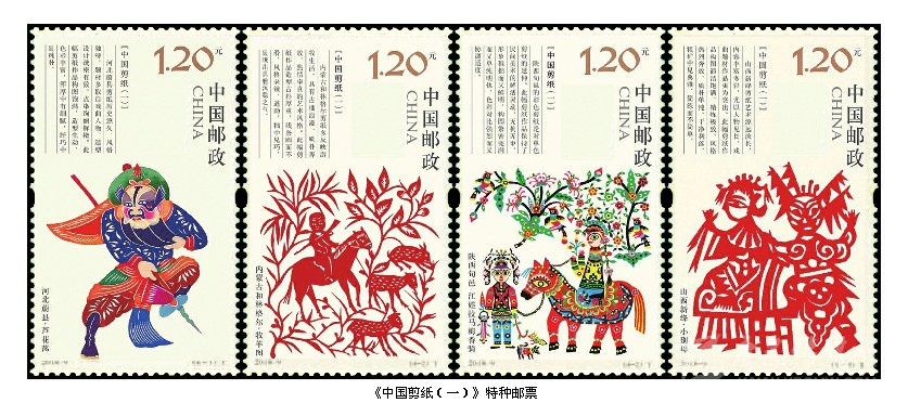 2018年1月24日,中國郵政發(fā)行《中國剪紙(第一組)》特種郵票,全套4枚。這是中國郵政繼1959年1月1日發(fā)行的《剪紙》特種郵票59年后重新發(fā)行的《中國剪紙》系列郵票。全系列郵票計(jì)劃發(fā)行4組,每組4枚。這次發(fā)行的第一組4枚郵票入選內(nèi)容分別是被列入第一批國家級(jí)非物質(zhì)文化遺產(chǎn)名錄的北方四處剪紙傳承人的作品:第一枚“河北蔚縣·蘆花蕩”,河北蔚縣剪紙歷史悠久,風(fēng)格獨(dú)特,題材多取自于人物,造型設(shè)計(jì)疏密有致,點(diǎn)染絢麗鮮艷。此幅作品作者王老賞(1890-1951),河北省蔚縣南張莊村人;第二枚“內(nèi)蒙和林格爾·牧羊圖”,內(nèi)蒙古和林格爾剪紙多反映游牧生活,具有古拙浪漫、質(zhì)樸奔放、熱情率真的藝術(shù)風(fēng)格。此幅作品作者張花女 (1903-2004),和林格爾縣董家營鄉(xiāng)曹老八夭村人;第三枚“陜西旬邑·江娃拉馬梅香騎”,陜西旬邑的彩色剪紙具有民間美術(shù)的鮮活靈動(dòng),無拘無束,形象稚拙而又鮮明,構(gòu)圖緊密完滿而又單純明快,色彩對(duì)比強(qiáng)烈而又協(xié)調(diào)適度。此幅作品作者庫淑蘭(1920-2004),陜西咸陽市旬邑縣張洪鎮(zhèn)赤道鄉(xiāng)富村人;第四枚“山西新絳·小別母”,山西新絳剪紙藝術(shù)源遠(yuǎn)流長(zhǎng),內(nèi)容豐富多彩,尤以人物見長(zhǎng),戲曲題材作品更為突出,構(gòu)圖簡(jiǎn)潔飽滿、精煉極致,粗獷中見典雅,簡(jiǎn)煉而不簡(jiǎn)單。此幅作品作者蘇蘭花(1906-1995),山西運(yùn)城市新絳縣澤掌鎮(zhèn)北蘇村人。