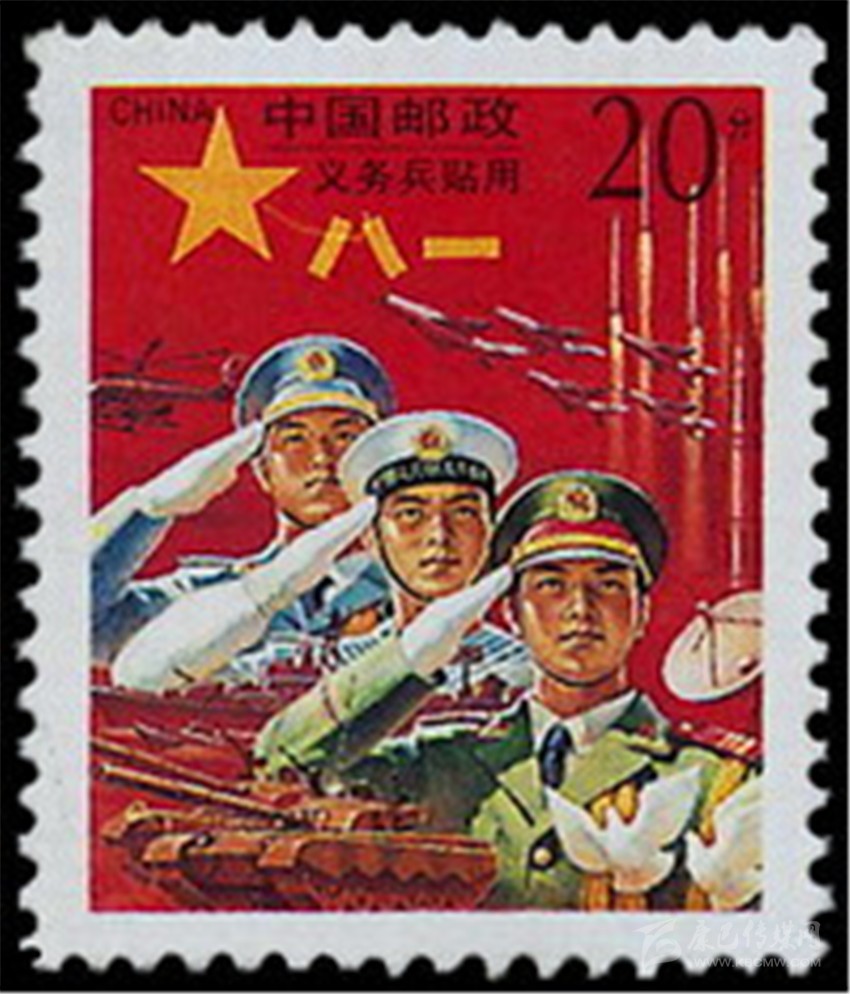 1995年8月1日,原郵電部試發(fā)行一套“義務(wù)兵專用”郵票一套1枚(圖5),票名為“神圣的使命”,圖案以紅光四射的“八一”軍旗為背景,以現(xiàn)代化的飛機(jī)、坦克、火箭和象征和平的白鴿為襯托,畫面是威武的陸??杖姡@示我軍鋼鐵長城般功無不克、戰(zhàn)無不勝的精神風(fēng)貌。