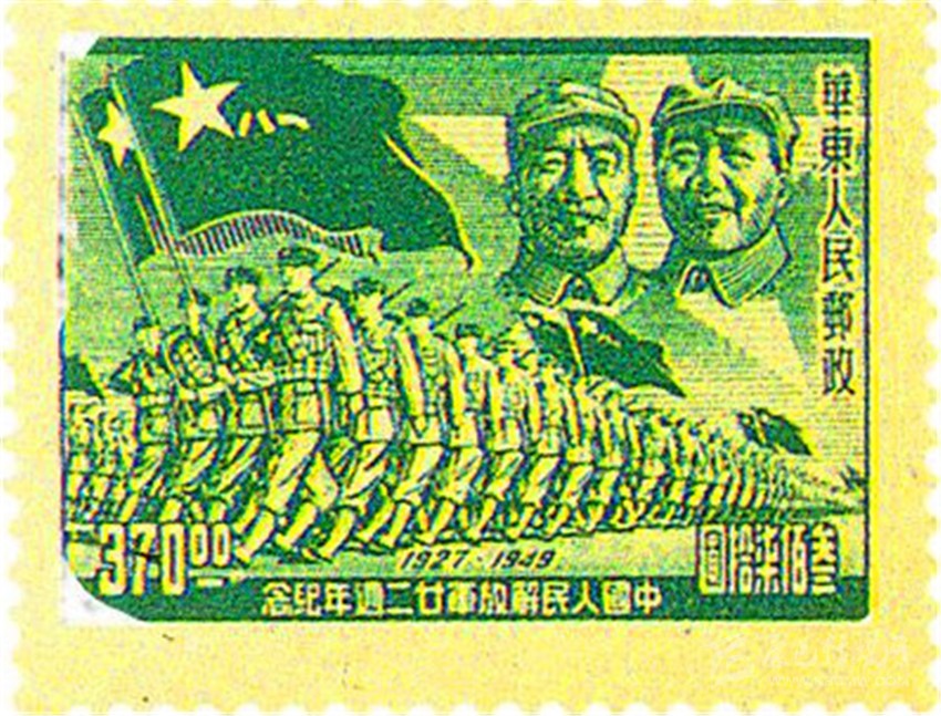 我國最早出現(xiàn)“八一軍旗”的郵票,是1949年8月1日, 剛解放的上海華東人民郵政發(fā)行的《中國人民解放軍建軍22周年》俗稱《華東進(jìn)軍圖》郵票(圖1),一套5枚,同圖異色異值,郵票右上方為毛澤東主席和朱德總司令頭像,下方是鐵流般的人民軍隊(duì)高舉著一面面“八一軍旗”。 同年12月,西南區(qū)人民郵政又發(fā)行一套11枚圖案相同“西南進(jìn)軍圖”郵票(圖2)。