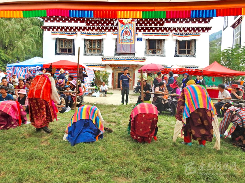 清順治十年(1653年),西藏五世達(dá)賴派德莫諸古到巴塘仿照拉薩哲蚌寺洛色林修建了丁寧寺大殿。大殿落成裝飾一新,舉行開光典禮時,在丁寧寺十四納卡活佛庚呷洛絨曲珠從西藏請來的藏戲大師群覺納的指點下,由寺僧表演了《江嘎冉》《扎西協(xié)哇》等藏戲劇目。