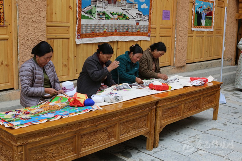 在藏繡展點,5名農牧民婦女正在合繡一幅藏族建筑刺繡作品?!拔覐?6歲開始跟著父親學藏繡,傳到我這已經(jīng)是第四代了。除了‘六長壽’、度母像等傳統(tǒng)圖案,今年是新中國成立70周年,我還繡了一幅天安門作品?!?7歲的傳承人達打介紹道。