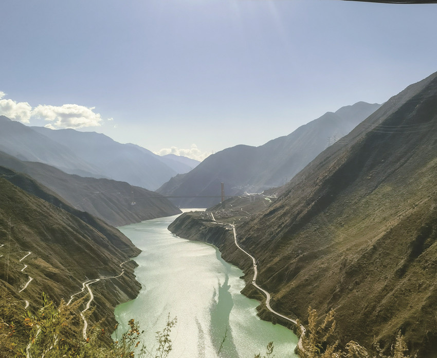 上嵐安的盤山路,在不停的彎折,每一個折又將路往上抬升一些,看著離大渡河越來越遠(yuǎn),應(yīng)該離嵐安近了。汽車在這條并不寬的路上行使,車窗外掠過的景色讓人有些意外。從來沒有從這個角度看過大渡河和沿河的景色,耀眼的陽光下,嵐安大橋橫跨大渡河,不遠(yuǎn)的地方是一個小村子,河水靜靜的流淌,平靜的河面如緞面般光滑。順著河流的方向,更遠(yuǎn)的地方就是雅康高速上的大渡河大橋,紅色的大橋在周圍藍(lán)的、綠的、灰的、白的顏色之中,很搶眼。這時,我們走過的路,也在身后像一條細(xì)細(xì)的白色帶子繞在山坡上。路旁高高的野草隨風(fēng)而動,黃色的莖須像極了豐收時的青稞。因為是第一次來,每一眼看見的都是新鮮,上山的路,也就沒有想象中艱難。不過,聽說這條還算平坦的水泥路是新修的,之前的土路,又窄又陡,遇到會車都是很困難的。