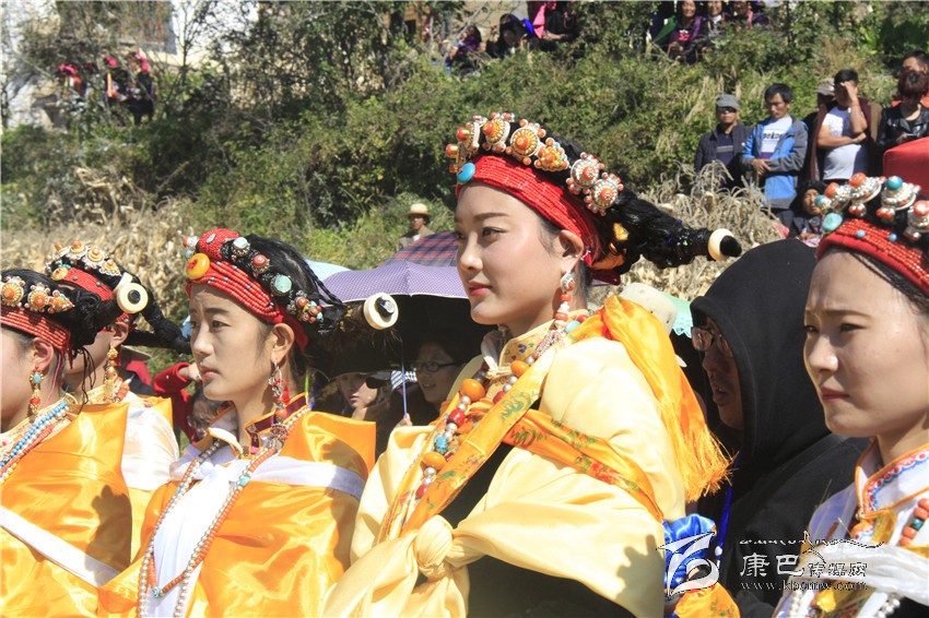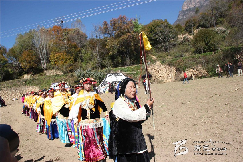 所有的祈福儀式結(jié)束后,村子里一位德高望重的長(zhǎng)輩走上圓臺(tái),用雄渾有力的嗓音向場(chǎng)地外等候的人們發(fā)出指令。在一段念詞結(jié)束之后,參加成人儀式女孩們的父親們?cè)谝晃焕先说闹敢戮従彽南驁?chǎng)地中央走來,老人手舉一幅一米高的唐卡畫,口中念念有詞,走在他后面的父親們一襲白色的毪衫,頭戴一頂灰色的禮帽,腳穿紅黑相間的藏靴,頸上掛著一根潔白的哈達(dá),滿臉肅然的緊隨老人之后,來到月形的臺(tái)子邊,站成一個(gè)半圓形。當(dāng)父親隊(duì)站定后,母親隊(duì)們也向場(chǎng)地中移步而來,本次成人儀式的主角們?cè)谝晃焕习尩膸ьI(lǐng)下向場(chǎng)地中走來,每一位女孩穿著打扮都是那么的光鮮靚麗,每一個(gè)人都顯得美麗動(dòng)人,她們披著黃色的披風(fēng),一根白色的哈達(dá)在胸前打著結(jié),五顏六色的哈達(dá)懸掛在這根哈達(dá)上,在姑娘們的后背迎風(fēng)飄飛。走到圓臺(tái)邊,小女孩們也圍成半圓,低著頭,等待著喇嘛們的念經(jīng)祈福和家人的祈福。此時(shí),兩位吉祥老人站了起來,手中拿著凈瓶,走到姑娘們面前,一邊念誦經(jīng)文,一邊將手中凈瓶里的水倒在姑娘們的手心里,姑娘們則虔誠的將這圣水輕輕的抹在自己的額頭上,寓意吉祥如意。待喇嘛主持儀式結(jié)束后,主持儀式的老人用嘉絨語向蒼天和墨爾多神山祈禱,希望神賜予孩子們美麗的面容和美好的心靈,從今日起,她們就可以真正的長(zhǎng)大成人了。吉祥詞念誦完后,母親們排著長(zhǎng)長(zhǎng)的隊(duì)伍緩緩來到孩子們的面前,將懸掛在胸前的哈達(dá)取下,久久的凝視著女兒的臉,眼角掛著幸福的淚水,用顫抖的聲音為女兒祈福,叮囑孩子們要孝敬父母,做一個(gè)正直善良的人,然后,才將白色的哈達(dá)掛在女兒的頸上,父親們則站在原地,看著母親們將哈達(dá)和祝福送給女兒,見證著女兒們的長(zhǎng)大成人。接受完父母和長(zhǎng)輩們的祝福之后,盛大的鍋莊舞會(huì)開始了。小女孩們也跟隨著這些舞者們手牽著手走到場(chǎng)地中央,跳起歡快的鍋莊舞。擁忠大娘說,成年禮上的鍋莊舞會(huì)一般都要視參加成人禮儀式女孩們親戚多寡而定,每一名長(zhǎng)輩都會(huì)走到場(chǎng)地中牽頭,跳起舞蹈,這時(shí)候是女孩的長(zhǎng)輩們炫耀舞技和歌聲的時(shí)候,他們矯健的舞步和甜美的歌喉迎來眾人的和鳴。