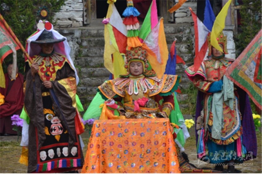 思路還是回到戲劇問(wèn)題上來(lái),在我以往欣賞的藏戲,其演出場(chǎng)所都設(shè)在露天,演員和觀眾在同一平臺(tái)的草地上,有時(shí)在平臺(tái)四周有山坡,那便是觀眾最好的看戲處。不過(guò),從高處往低處看,效果還是不及平視的效果好。表演藏戲的舞臺(tái)在草地中央,觀眾圍著中央草地形成一個(gè)半包圍圈,演出幾乎沒(méi)有布景,即便有,也是簡(jiǎn)單的一些桌椅、祭臺(tái)之類的簡(jiǎn)單道具。在演出中,一個(gè)演員身著各類色彩鮮艷的帽、旗及其盔甲服裝等大于人體體型的飾物,這樣做的目的顯然是為了增強(qiáng)演出的鮮明性,尤其演員穿著厚底高靴,體型龐大,頭戴面具,嗓音洪亮,動(dòng)作凝重而富有節(jié)奏,使整個(gè)演出富有較強(qiáng)的穿透力和沉重感。藏戲的音樂(lè)也比較簡(jiǎn)單,主音節(jié)奏依靠長(zhǎng)號(hào)、大鼓、鈸等,曲目轉(zhuǎn)換時(shí)則多以笛子演奏,間或插入海螺聲、嗩吶聲等。整個(gè)藏戲的故事情節(jié)則是依靠舞蹈和合唱來(lái)漸次推進(jìn)的。藏戲作為祖國(guó)文化大家庭中的成員之一,自然有著自己獨(dú)特的特點(diǎn),有著屬于自身的文化藝術(shù)和生活土壤的傳承因子。藏戲誕生在一個(gè)特殊的環(huán)境里,它既在風(fēng)格、形態(tài)、特征和韻致上包含著與其他戲劇相似的共通性,同時(shí),它又蘊(yùn)涵著與眾不同的自身的內(nèi)涵特征。總之,藏戲在“歌、舞、劇、技等方面的有機(jī)結(jié)合,虛擬寫(xiě)意的表現(xiàn)型戲劇,程式化表演手段,自由靈活的演出時(shí)空概念,??????它又具有與古希臘戲劇很類似的貫穿始終的講解人和伴唱伴舞隊(duì),面具表演,三面以至四面觀眾的廣場(chǎng)演出,一部分生活化寫(xiě)實(shí)表演,演出時(shí)空的間接固定場(chǎng)景,史詩(shī)式講唱文學(xué)的劇本結(jié)構(gòu)和說(shuō)唱藝術(shù)的演出格式等特殊之處?!薄緞⒅救骸吨袊?guó)藏戲史》4頁(yè)】因此,在藏戲的諸多元素中,我們可以看到顯著的特征,這就是明顯的原始巫文化和原始苯教文化的痕跡,無(wú)論是在藏戲的臺(tái)詞、面具和服飾中,還是在藏戲的音樂(lè)、樂(lè)器和表演形式上,不難看出藏戲的這一本土特征,至于與其他戲劇流派的類似之處,我以為,一方面是戲劇本身固有特征的表現(xiàn),另一方面或許是一種合理吸納所致。