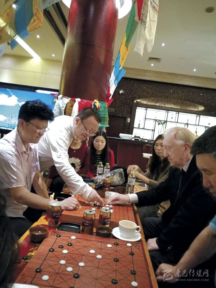 藏族群眾與外國藏棋研究學(xué)者交流藏棋文化。