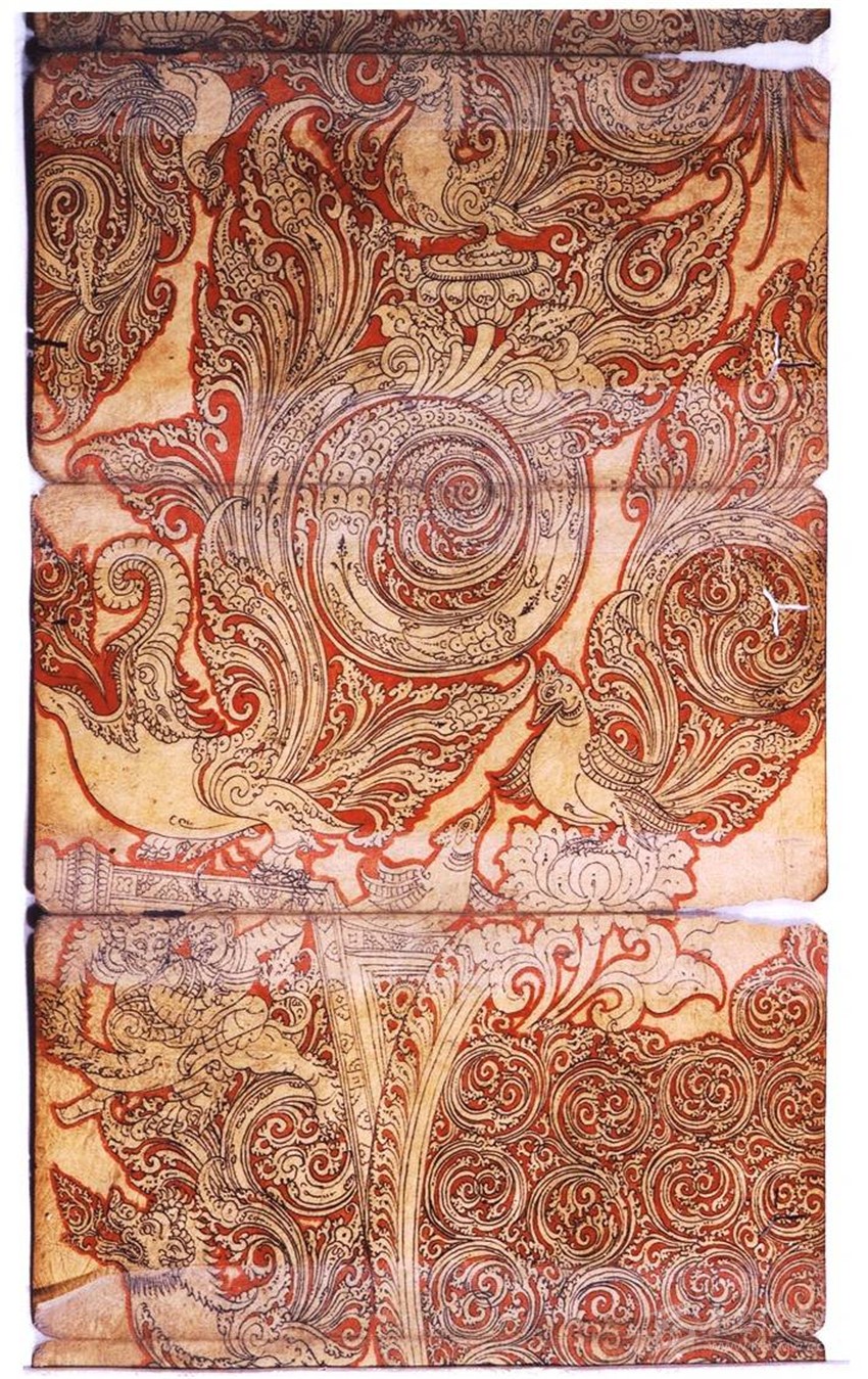 (二)裝飾圖案化:藝術(shù)中的“希臘化”過(guò)程,蔓延到南亞地區(qū),已是“強(qiáng)弩之末”。故南亞美術(shù)受到希臘藝術(shù)的影響,但是并不徹底。所以在表現(xiàn)物象體積和空間的時(shí)候,顯得力不從心,往往是想寫(xiě)實(shí)的物象表現(xiàn)成裝飾性的圖案,時(shí)間一長(zhǎng),便演變成為南亞的審美傳統(tǒng)。比如各種動(dòng)物和植物紋樣,以及卷草紋、連珠紋等。尼瓦爾唐卡中的人物、動(dòng)物、植物和事物大多通過(guò)精美的、圓弧組成的各種裝飾圖案來(lái)表現(xiàn)。