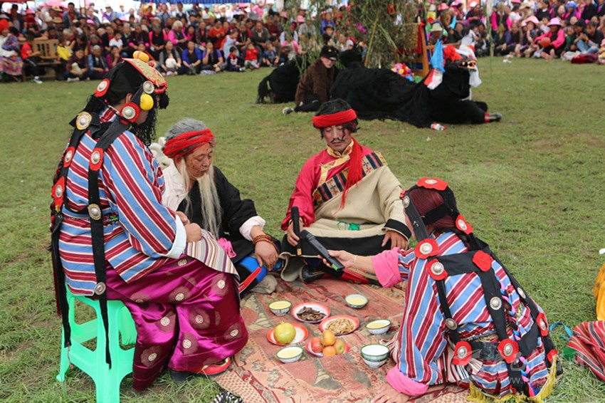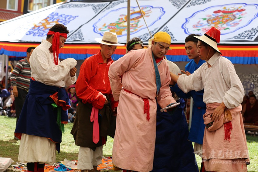 九月,龍王塘,藏戲《嘎拉旺布》演出現(xiàn)場(chǎng)。西繞反串花仙卓瓦桑姆,他頭戴花冠,頂上的三叉“巴珠”(后藏女人的一種頭飾)上插滿了粉色和紅色的絹花。身上穿著各色綢緞拼制成的無袖藏袍“拉姆切”,上套無袖彩條花氆氌帶和藍(lán)綠花緞帶連綴成的褂子。踩著鼓與鈸敲擊出的節(jié)奏,他的兩只腳進(jìn)、頓、點(diǎn)、退,舞步輕盈,手腕跟隨節(jié)奏,以頭部和肩部為限,左舞右蹈,用肢體語言表現(xiàn)人物的思想感情,這是該劇第一幕《定情月下》:湖畔仙景,卓瓦桑姆偕眾仙女婆娑起舞。國(guó)王隨仙鹿而來,向卓瓦桑姆傾訴衷情,花仙為國(guó)王的真情所動(dòng),愿永結(jié)同心。仙翁降臨贈(zèng)箭祝福,二人辭別眾仙……。炎炎烈日下,西繞薄施脂粉的面頰已被幾行汗水弄花,但他不以為意,此時(shí)此刻,他不是西繞,而是花仙卓瓦桑姆。從進(jìn)場(chǎng)伊始,他便與角色融為一體。周遭的觀眾認(rèn)真觀看、解讀,現(xiàn)場(chǎng)一片和諧,最美的時(shí)光在這一刻被盡情雕刻。