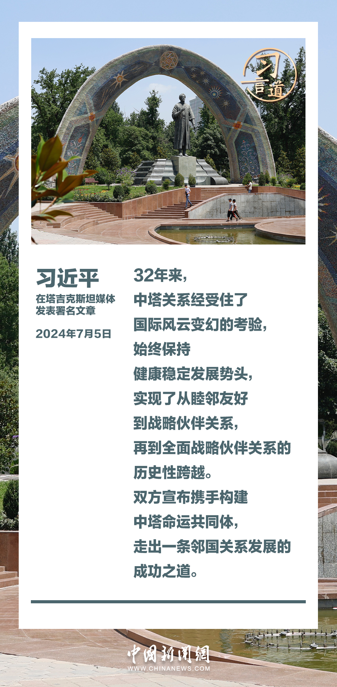 7月5日,在對塔吉克斯坦進(jìn)行國事訪問之際,國家主席習(xí)近平在塔吉克斯坦《人民報》和“霍瓦爾”國家通訊社發(fā)表題為《共創(chuàng)中塔關(guān)系美好明天》的署名文章。習(xí)近平指出——