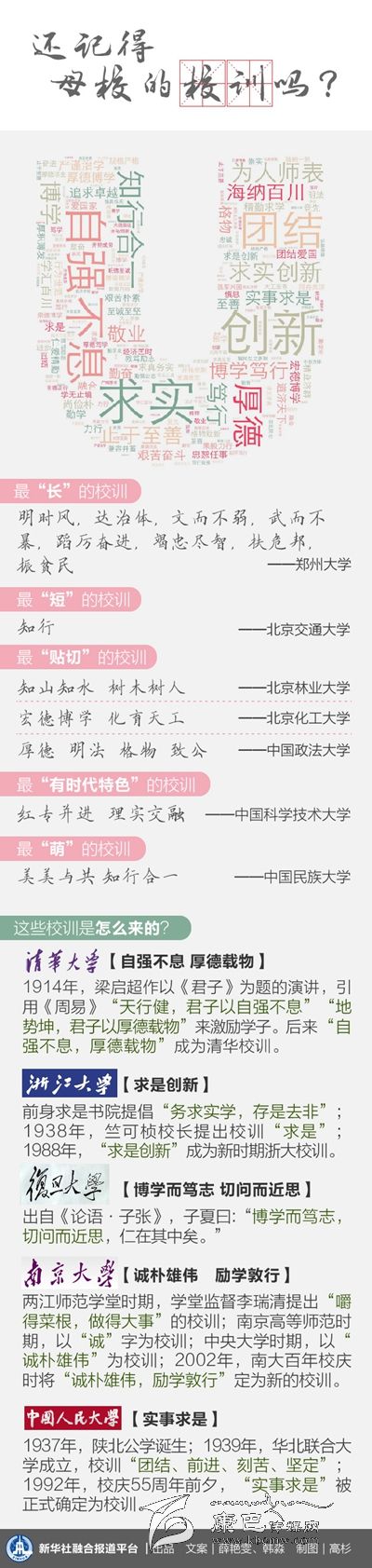 一份對(duì)100多所中國高等學(xué)府校訓(xùn)的統(tǒng)計(jì)顯示,出現(xiàn)頻次最高的詞是“求實(shí)”,其次是“創(chuàng)新”、“博學(xué)”、“厚德”,一個(gè)‘實(shí)’字始終貫穿于不同時(shí)代、不同環(huán)境的校訓(xùn)之中。