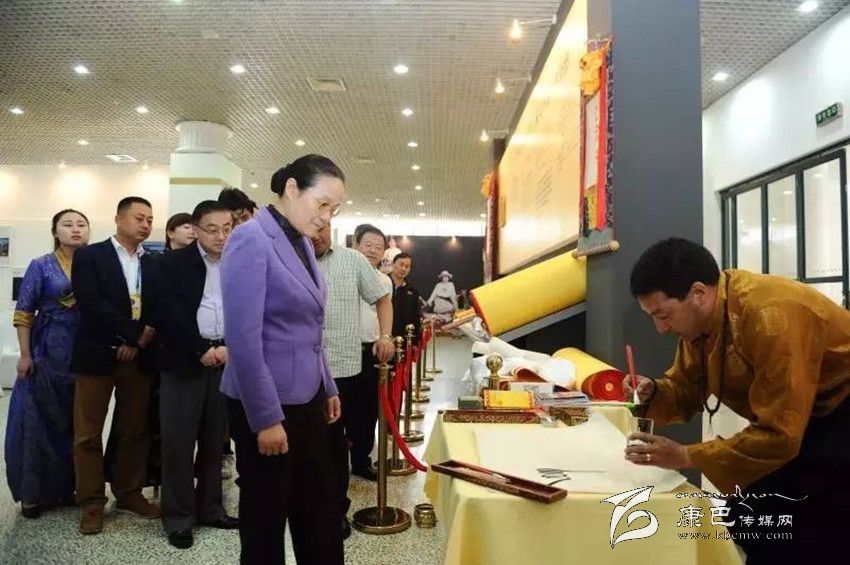 在展覽中心,趙雯在州政府副州長葛寧等的陪同下,觀看了甘孜旅游宣傳片,參觀了甘孜旅游圖片展、藏傳佛教宮廷精品文物展、“藏藝通”旅游商品展和藏文書法展,仔細(xì)聽取講解介紹,對甘孜州舉辦此次活動給予了充分肯定。趙雯還興致勃勃地觀看了四川省級藏文書法傳承人、著名的藏文書法家巴松鄧珠現(xiàn)場藏文書法表演,品嘗了甘孜州康定藍(lán)逸高原食品有限公司的高原特色產(chǎn)品。