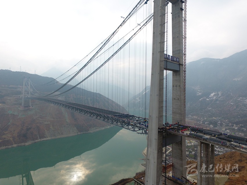 “大橋鋼桁梁完成合龍,標志著大橋全面進入橋面施工階段,也標志著這座建設(shè)在高海拔、高地震烈度帶、復(fù)雜風場環(huán)境下的超大跨徑鋼桁梁懸索橋,施工中最難、風險最大的施工全面完工?!毖趴蹈咚夙椖坎扛苯?jīng)理柏國勝激動地說。