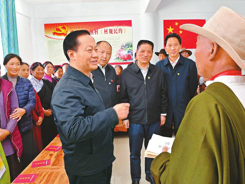 在村民澤翁家中,彭清華細(xì)致察看整修后的旅游民宿,了解房屋結(jié)構(gòu)功能、抗震設(shè)防標(biāo)準(zhǔn)和修建費用等,與一家人拉家常、聊增收,鼓勵他們再接再厲,把日子越過越好。雅德鄉(xiāng)交納村平均海拔3300米,是典型的高原藏區(qū)貧困村。彭清華沿著崎嶇的山路步行來到貧困戶亞瑪忠登和根呷家中,與他們圍坐在一起,共同分析致貧原因和脫貧進(jìn)展,詳細(xì)了解各項幫扶措施落實情況,為他們脫貧增收鼓勁支招。在交納村村委會辦公室,彭清華與在這里參加合作社入股分紅活動的村民們親切交談。他對在場的村干部和鄉(xiāng)親們說,習(xí)近平總書記、黨中央十分牽掛藏區(qū)群眾,對扎實做好藏區(qū)經(jīng)濟(jì)發(fā)展、民生改善和社會和諧穩(wěn)定特別是脫貧攻堅等方面工作作出一系列重要指示、提出明確要求。我們要認(rèn)真學(xué)習(xí)領(lǐng)會、堅決貫徹落實。希望鄉(xiāng)親們始終銘記習(xí)近平總書記的深切關(guān)懷,進(jìn)一步堅定脫貧信心,大力發(fā)展生產(chǎn),積極學(xué)習(xí)技術(shù),尤其要重視孩子們的培養(yǎng)教育,讓適齡少年兒童都能接受義務(wù)教育,堅決阻斷貧困代際傳遞。要充分發(fā)揮群眾的積極性和主動性,引導(dǎo)村民依靠自己的辛勤勞動拔窮根、摘窮帽,早日脫貧致富奔小康。