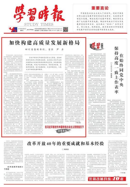 編者按:8月8日,《學習時報》頭版頭條“在習近平新時代中國特色社會主義思想指引下”欄目刊載四川省委副書記、省長尹力的署名文章《加快構(gòu)建高質(zhì)量發(fā)展新格局》,本網(wǎng)今日予以轉(zhuǎn)載:
