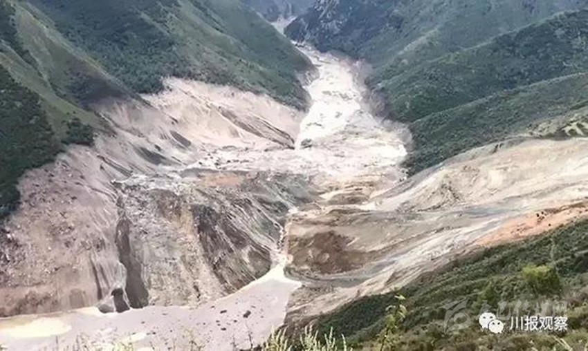 另據(jù)四川省防指和四川省水利廳工作組反饋:堰塞湖所在江段長約10.6公里,河谷為“V”形峽谷,兩側(cè)岸坡坡度20~60°,河谷結(jié)構(gòu)為斜向谷。河道上游彎曲、下游稍順直,水流急,局部稍緩。初步統(tǒng)計,該段江段共有滑坡10處,崩塌3處,泥石流溝8條。其中有2處大型滑坡,即則學(xué)滑坡和仁達滑坡。