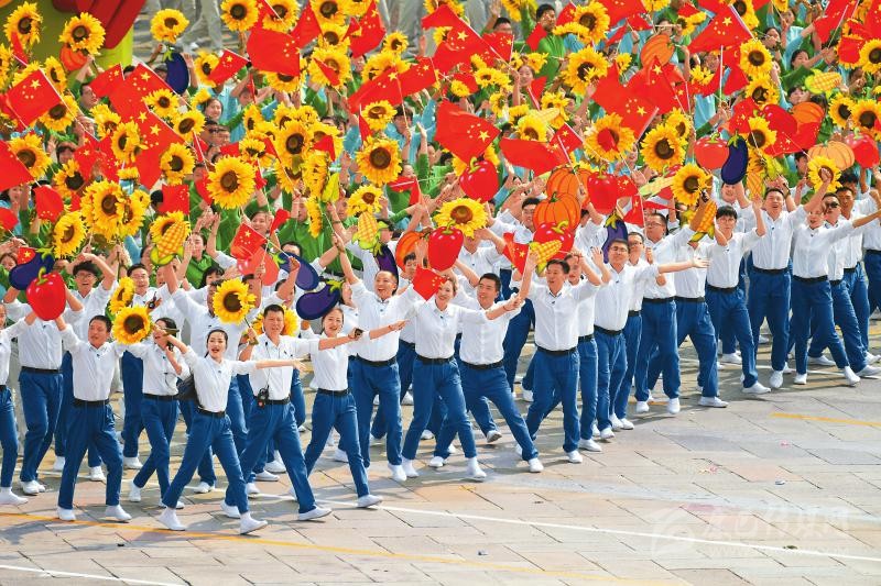 金秋時節(jié)的北京,張燈結(jié)彩,繁花似錦,處處洋溢著節(jié)日的喜慶氣氛。從天安門廣場到金水橋南端,大型“紅飄帶”主題景觀、7棵特效光影“煙花樹”、LED巨幅網(wǎng)幕、3000多名手持“光影屏”的聯(lián)歡群眾以及各族各界群眾,將聯(lián)歡活動核心區(qū)域裝扮得流光溢彩、絢麗奪目。10個群眾聯(lián)歡區(qū)分布長安街沿線,數(shù)萬群眾以歡歌熱舞,點贊共和國、謳歌新時代。