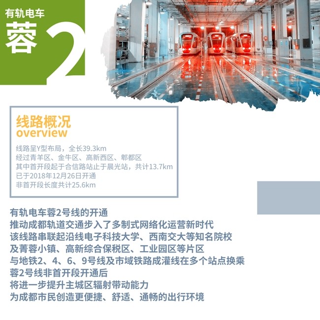 有軌電車(chē)蓉2號(hào)線工程線路呈Y型布局,線路經(jīng)過(guò)青羊區(qū)、金牛區(qū)、高新西區(qū)、郫都區(qū),線路全長(zhǎng)39.3km。其中首開(kāi)段起于合信路站,止于晨光站共計(jì)13.7km,已于2018年12月26日開(kāi)通,非首開(kāi)段長(zhǎng)度共計(jì)25.6km。
