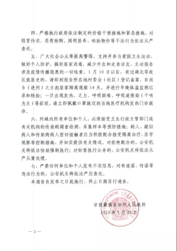 2020年1月24日,我州已全面啟動突發(fā)公共衛(wèi)生事件I級應(yīng)急響應(yīng)。根據(jù)《中華人民共和國突發(fā)事件應(yīng)對法》《中華人民共和國傳染病防治法》《突發(fā)公共衛(wèi)生事件應(yīng)急條例》等法律法規(guī),為確保人民群眾生命安全和身體健康,現(xiàn)就加強我州新型冠狀病毒感染的肺炎聯(lián)防聯(lián)控工作有關(guān)事宜通告如下。一、自本通告發(fā)布之日起,全州所有旅游景區(qū)景點、圖書館、文化館、博覽館、電影院、歌舞娛樂場所、洗浴場所、網(wǎng)吧、宗教活動場所等人員密集場所暫停營業(yè)(或?qū)ν忾_放),并暫停涉旅企業(yè)組織的團隊旅游活動。二、疫情防控期間,一律取消或延遲集會展覽、文化體育、集體宗教活動等群眾性聚集活動。禁止任何集體、個人和餐飲服務(wù)單位舉辦任何形式的群體性聚會、聚餐活動。如遇婚禮請取消或延遲舉辦;喪事一律從簡并嚴(yán)格控制參加人數(shù)、落實防控措施。餐飲服務(wù)單位、鄉(xiāng)廚和專業(yè)加工團隊不得承辦群體性聚餐宴席(包括農(nóng)村壩壩宴)。三、關(guān)閉活禽交易宰殺市場,禁止在集貿(mào)市場銷售、宰殺活禽和從事野生動物捕獵、交易,野生動物飼養(yǎng)繁育場所應(yīng)當(dāng)實施隔離措施,禁止餐飲服務(wù)單位和個人使用野生動物加工、制售食品。四、嚴(yán)格執(zhí)行政府依法制定的價格干預(yù)措施和緊急措施,對假冒偽劣、惡意搶購、囤積居奇、哄抬物價等不法行為依法從嚴(yán)查處。五、廣大社會公眾要提高警惕,支持并參與愛國衛(wèi)生運動,做好個人防護,搞好居家消毒,減少外出和走親訪友,主動報告涉及疫情傳播隱患的一切線索。1月10日以后,有過湖北等疫區(qū)旅居史的,請即刻報告所在地村委會(社區(qū))登記備案,自返鄉(xiāng)(進州)之日起居家隔離觀察14天,并進行早晚體溫監(jiān)測記錄和核驗;一旦出現(xiàn)發(fā)熱、乏力、呼吸困難、呼吸道感染(干咳為主)等癥狀,請立即佩戴口罩就近到當(dāng)?shù)蒯t(yī)療機構(gòu)發(fā)熱門診就診。六、州域內(nèi)所有單位和個人,必須接受衛(wèi)生行政主管部門或有關(guān)機構(gòu)的傳染病調(diào)查檢測、采集樣本等預(yù)防措施;病人、疑似病人和傳染病病人密切接觸者應(yīng)當(dāng)積極配合接受隔離治療、醫(yī)學(xué)觀察等控制措施,并如實提供有關(guān)情況。對拒絕配合的,公安機關(guān)將依法協(xié)助強制執(zhí)行;對妨害執(zhí)行公務(wù)的,公安機關(guān)將依法從嚴(yán)從重處理。七、嚴(yán)禁任何單位和個人發(fā)布不實信息,對有造謠、傳謠等違法行為的,公安機關(guān)將依法嚴(yán)厲查處。本通告自發(fā)布之日起施行,終止日期另行通告。