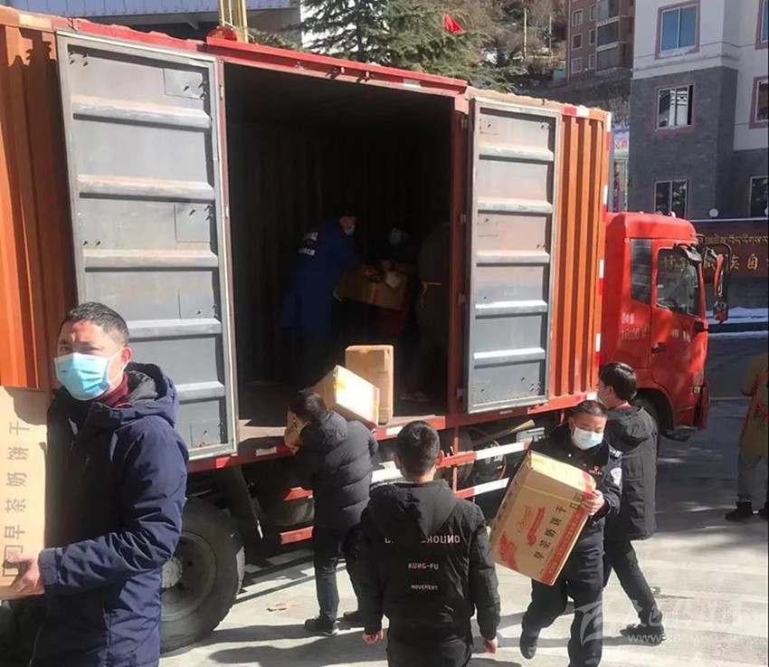 一箱箱方便面、牛奶、餅干等物資被搬運(yùn)進(jìn)了康定市衛(wèi)生健康局的大廳。