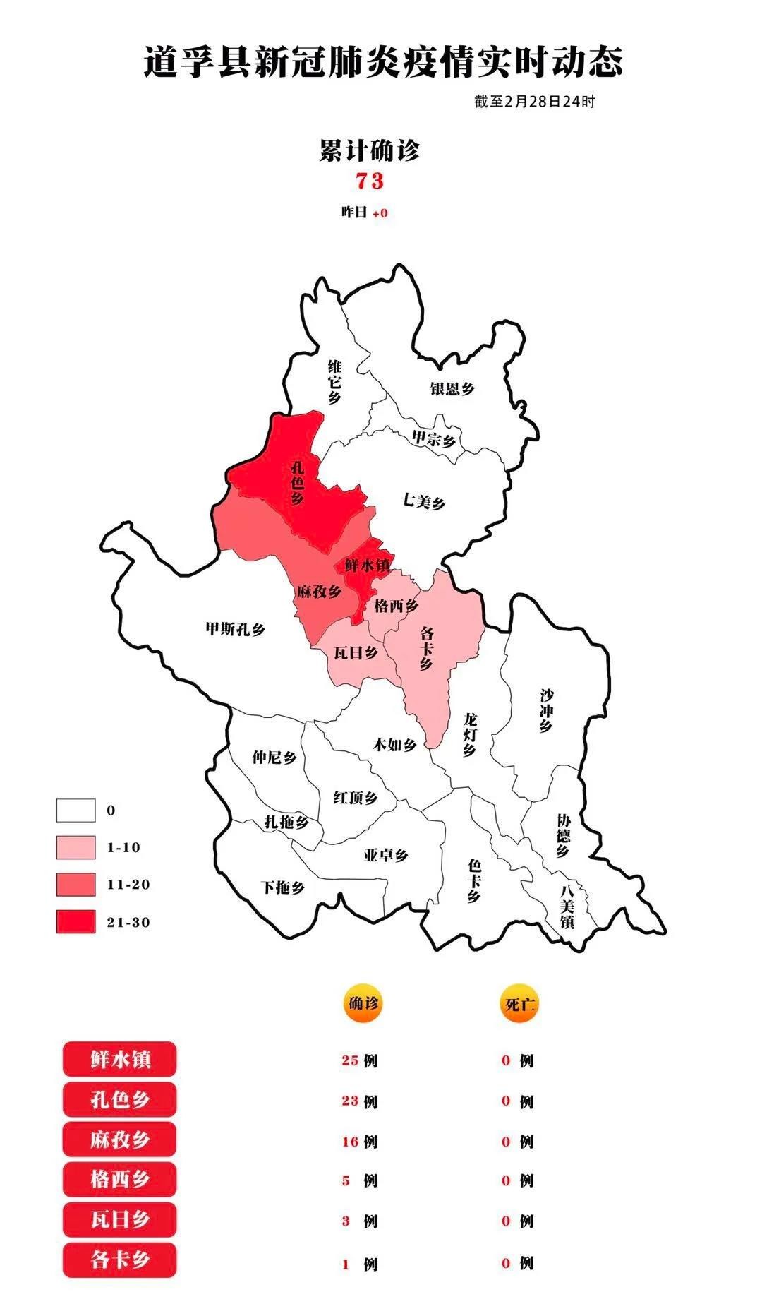 截至2月29日24時(shí),我州累計(jì)報(bào)告確診病例78例,累計(jì)治愈出院40人(道孚縣35人、康定市2人、色達(dá)縣2人、稻城縣1人),其余38人(重癥4例,危重癥1例)均在定點(diǎn)醫(yī)院隔離治療,231名密切接觸者正在接受醫(yī)學(xué)觀察。我州除道孚縣“五鄉(xiāng)一鎮(zhèn)”外,其余17個(gè)縣(市)連續(xù)26天無(wú)確診病例報(bào)告。