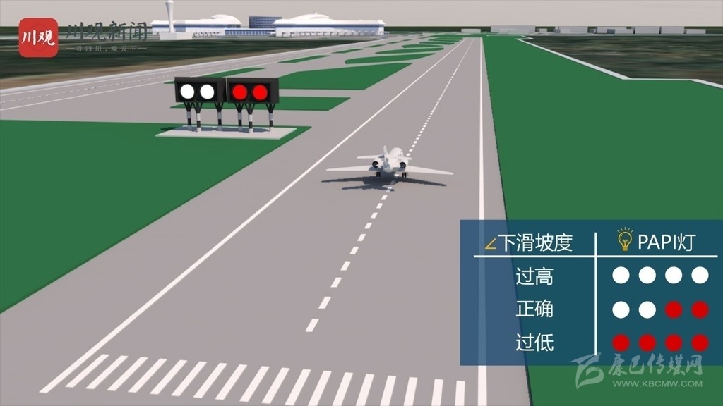 緊密進(jìn)近坡度指示器(PAPI),是一組由4盞燈組成的燈光系統(tǒng),一般放在跑道頭。飛行員從空中觀察,如果高于預(yù)定下滑道,PAPI燈顯示全白,反之則顯示全紅。飛行員如果看到兩紅兩白的PAPI燈,就說明飛機(jī)下滑坡度正確,能夠安全降落。
