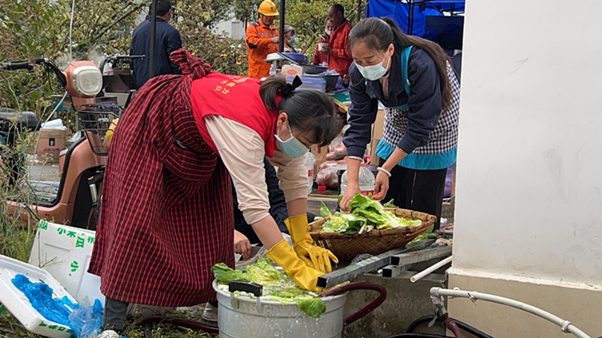 在得妥鎮(zhèn)北頭村的路旁,來自瀘定縣冷磧鎮(zhèn)桐子林村的李星芳和其他志愿者一起忙著切菜煮飯。她告訴記者,地震發(fā)生后,我主動報名加入志愿者團隊?!拔覀冞@個點上除了政府發(fā)放的物資,還有很多附近村民和好心人送來的菜肉和水果,大家都在用自己的行動出一份力?!闭诿χ胁说闹驹刚吆樾l(wèi)群說。就在記者采訪時,在北頭村開飯館的易姝宏一家送來了鹵菜、排骨和新鮮蔬菜,記賬員茍有成忙著清點數(shù)量并記錄在冊?!暗卣鸷螅謰尠涯赀~的奶奶送到瀘定縣城孃孃家,我也向單位請了假,今天我們一起趕回來在這里幫忙”。