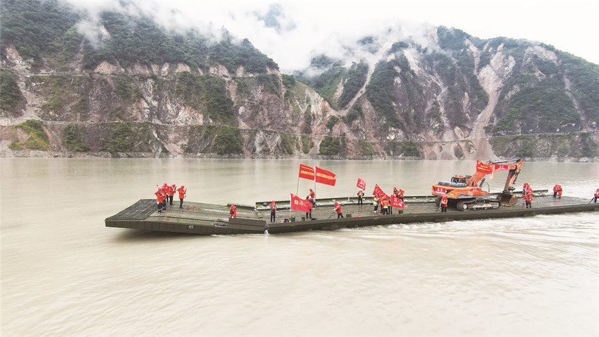 中午,天空再次傳來直升機(jī)的轟鳴聲。這次機(jī)會(huì)不能再錯(cuò)過,一名特警站在一輛商務(wù)車車斗里,手持一面國旗,由一人開著汽車奔馳。汽車奔馳,紅旗招展,鮮艷奪目的一抹紅在高山峽谷之間奔騰涌動(dòng),吸引了直升飛機(jī)的“目光”。隆隆的機(jī)聲越來越響,龐大的“鐵鳥”越飛越近,最后穩(wěn)穩(wěn)地停棲在三號(hào)營地的開闊場(chǎng)壩。期待已久的108人一下歡呼起來,胡娜如釋重負(fù)。