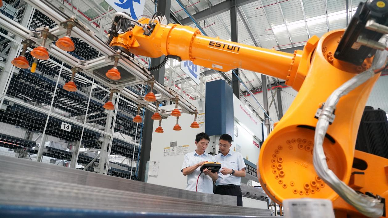 △2023年8月26日,在武漢光谷的一家長(zhǎng)江電氣企業(yè)智能車間,工作人員正在操作智能機(jī)械臂。