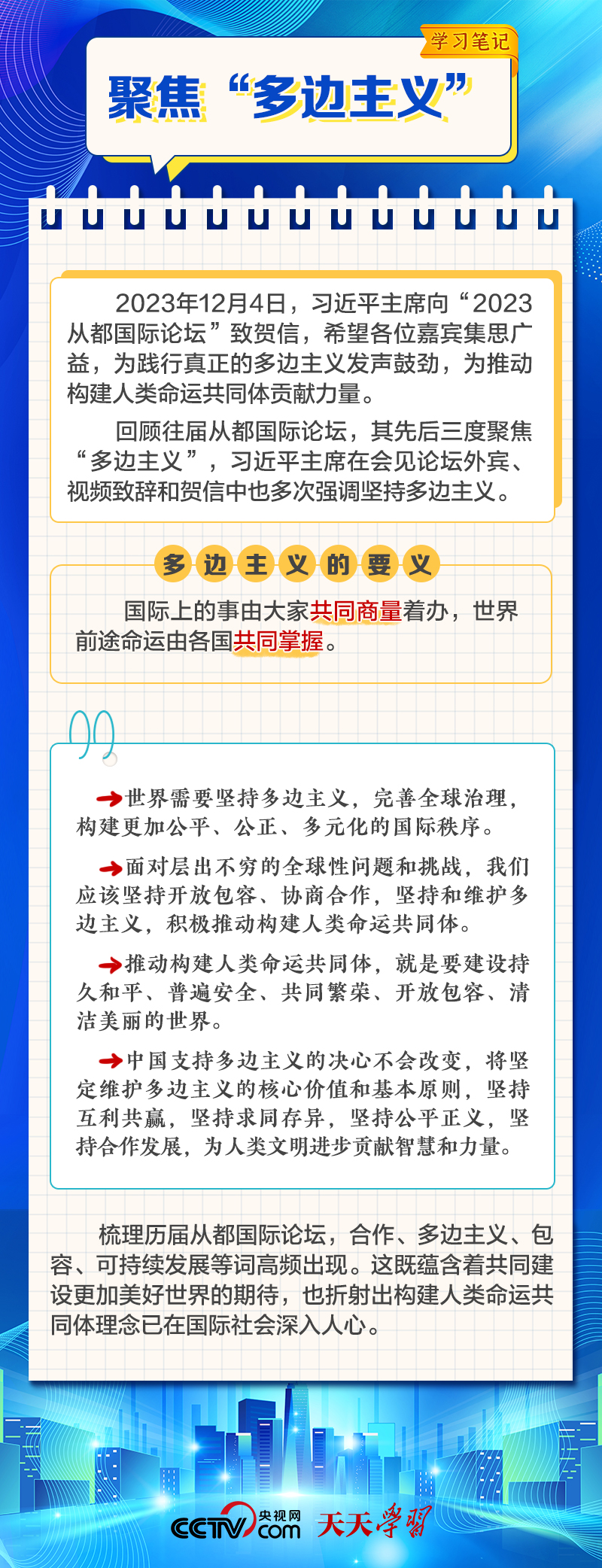 天天學(xué)習(xí)12月4日,習(xí)近平主席在致“2023從都國際論壇”的賀信中強(qiáng)調(diào),面對前所未有的世界之變、時(shí)代之變和歷史之變,人類社會必須團(tuán)結(jié)起來,堅(jiān)持互學(xué)互鑒、開放包容、合作共贏,弘揚(yáng)全人類共同價(jià)值,共同建設(shè)更加美好的世界。