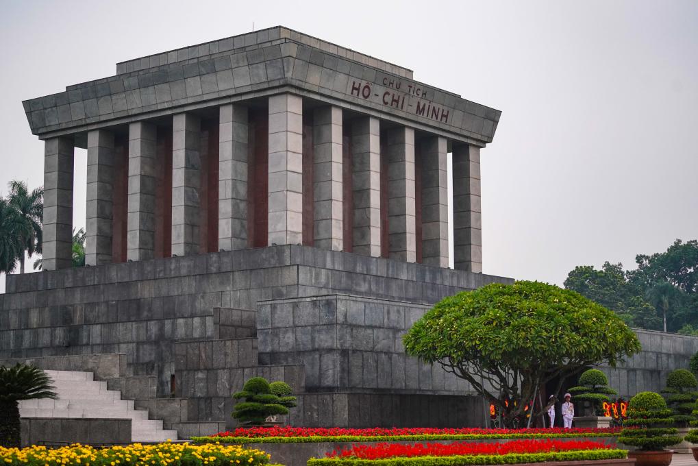 在河內(nèi)地標(biāo)巴亭廣場(chǎng)一側(cè),坐落著胡志明陵和胡志明故居。記者抵達(dá)廣場(chǎng)時(shí),守衛(wèi)胡志明陵的儀仗兵正在舉行換崗儀式,眾多民眾和游客高舉相機(jī)或手機(jī),記錄下這莊嚴(yán)肅穆的一刻。胡志明陵北側(cè)的胡志明故居內(nèi),各國游客排起長(zhǎng)隊(duì),在他曾長(zhǎng)期居住和工作的高腳屋下駐足留影。