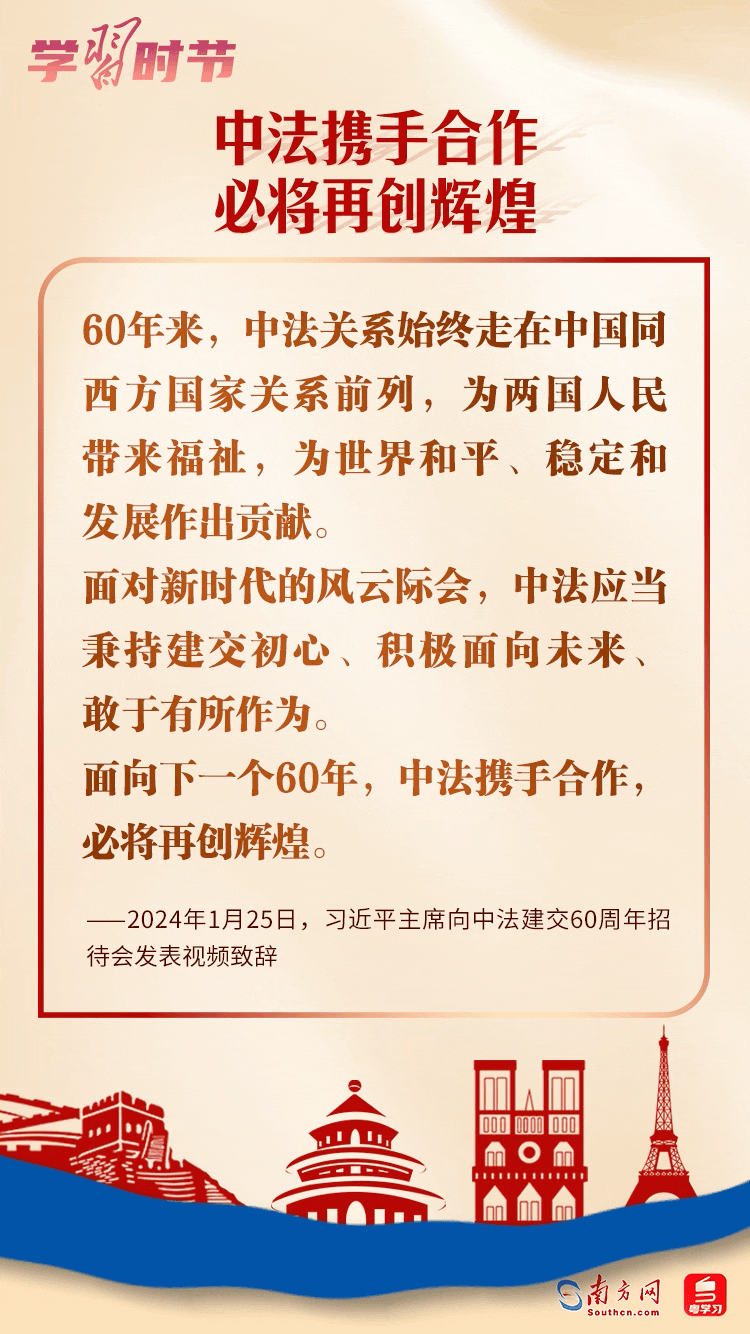 1月27日,國家主席習(xí)近平同法國總統(tǒng)馬克龍互致賀電,慶祝兩國建交60周年。習(xí)近平主席指出,60年前,中法打破冷戰(zhàn)堅冰、跨越陣營鴻溝,建立大使級外交關(guān)系。兩國關(guān)系創(chuàng)造多個“第一”、取得豐碩成果,不僅造福于兩國人民,也為維護世界和平穩(wěn)定、促進世界多極化和國際關(guān)系民主化發(fā)揮重要作用。