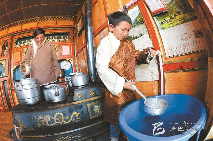 被稱為世界高城的理塘縣,“吃水難”過去一直是當(dāng)?shù)厝罕娚铍y題。2012年實(shí)施對(duì)口援建以來(lái),樂山市和理塘縣把此項(xiàng)工作列為 “一號(hào)民生工程”來(lái)抓。2013年,樂山市和理塘縣在位于海拔5000米的理塘縣奔戈鄉(xiāng)境內(nèi)的索絨山上開建奪曲河水庫(kù),2014年7月奪曲河水庫(kù)全部竣工,2015年10月,理塘縣首批2200戶自來(lái)水實(shí)現(xiàn)入戶,到今年底縣城中心城區(qū)將全部實(shí)現(xiàn)自來(lái)水入戶供水。圖為扎吉和家人正歡喜地接水準(zhǔn)備做飯。