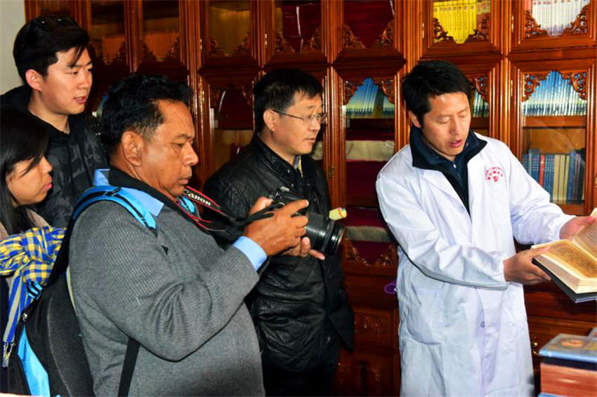 “扎西德格歡迎您們!”德格藏醫(yī)院院長雄呷激動的將潔白的哈達(dá)獻(xiàn)給了攝制組的每一位老師。藏醫(yī)伍金丹增邊走邊介紹:“德格是南派藏醫(yī)藥的發(fā)祥地,德格藏醫(yī)院的博物館內(nèi)收藏著各種藏醫(yī)藥經(jīng)典巨著,如《四部醫(yī)典》、《晶珠本草》、《藏藥二元藥訣》、《千萬舍利》、《訣竅秘籍》、《四部醫(yī)典注釋》、《苯醫(yī)》等。這里還有我們自己配制的320余種藏醫(yī)藥?!?/span>