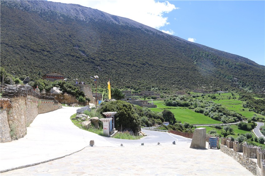 從觀景平臺(tái)向村子進(jìn)發(fā),一棟棟用石塊砌成的藏房次第映入眼簾,每一棟藏房都有獨(dú)立的院落,院墻上是堆放整齊的木柴,墻邊是造型別致的花臺(tái),有的房頂上還掛著五星紅旗。走到村口,黑化通村路變成了硬化聯(lián)戶路,道路寬敞整潔,路旁有太陽(yáng)能路燈、電子監(jiān)控、綠化花草和公共廁所;村中央的廣場(chǎng)上聚滿了人,他們有的是外來(lái)游客、有的是當(dāng)?shù)卮迕?,有的在曬著太?yáng)閑聊,有的在對(duì)著美景拍照。在村里,記者還發(fā)現(xiàn)有幾個(gè)小賣部、不少私家車和好幾大片長(zhǎng)勢(shì)良好的菜地,地里有一些人在勞作。