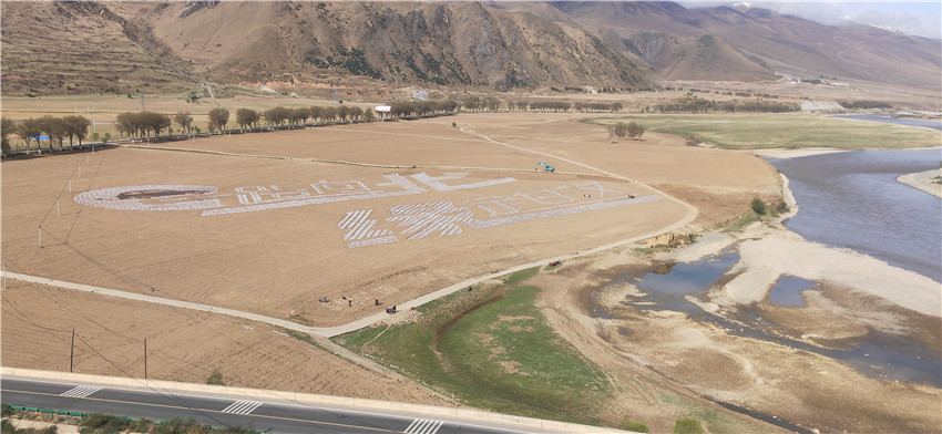 路的一側(cè)靠山,春播已畢的1639畝青稞地里,一個(gè)栩栩如生的油菜作物景觀拼圖呼之欲出。其上雖覆蓋白色地膜,造型卻是一目了然。