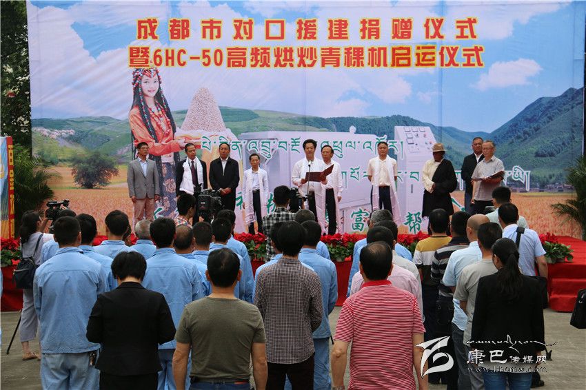 成都市委常委謝瑞武宣布50套全自動高頻青稞烘炒機(jī)啟運甘孜州。
