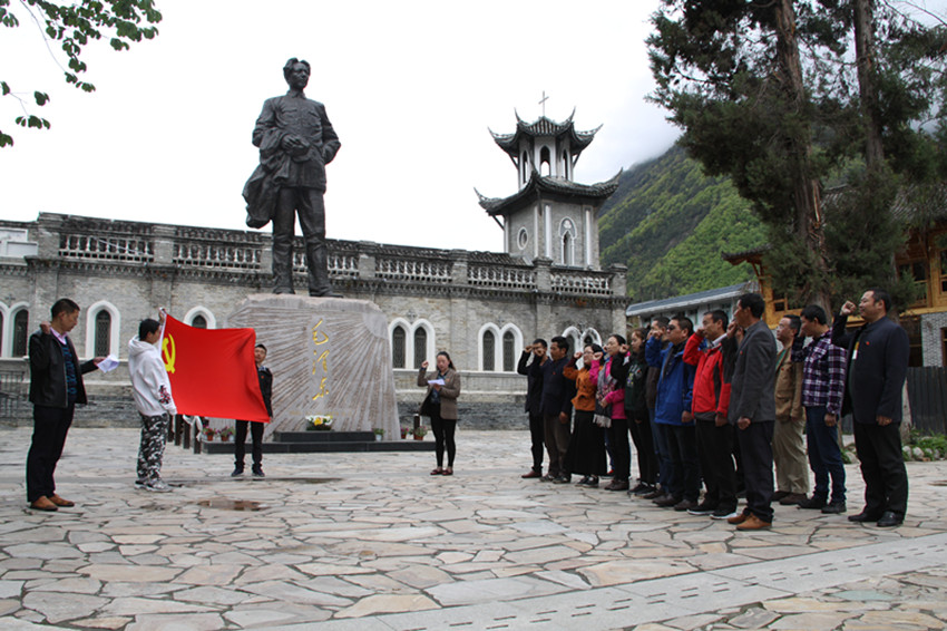 本網(wǎng)訊 (本網(wǎng)記者 秦松 攝影報道)日前,甘孜日報社全體黨員與群眾工作全覆蓋結對共建共創(chuàng)的海螺溝燕子溝鎮(zhèn)的躍進坪村支部、南門關村支部、麻柳林村支部、喇嘛溝村支部的黨員,懷著崇敬的心情來到磨西長征紀念館毛主席塑像前,舉行緬懷革命先烈、重溫入黨誓詞活動?;顒又?,黨員們還與共建共創(chuàng)支部黨員進行了座談。圖為宣誓活動現(xiàn)場。