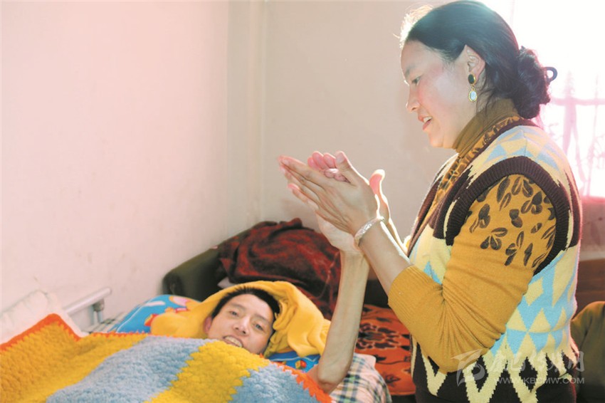 因為根絨的意外事故,家里沒有了經(jīng)濟來源。巨大的經(jīng)濟壓力,讓白措喘不過氣來。但她沒有向命運低頭,撫育3個孩子,就近務(wù)工掙錢補貼家用。同時,利用工作間隙回家,照顧丈夫吃飯,給他翻身,換洗沾滿屎尿的墊布……因為擔(dān)心丈夫久臥生褥瘡和肌肉萎縮,白措每隔3小時就要給丈夫翻身,還自學(xué)了一套按摩手法替根絨全身按摩。在她的精心照料下,根絨身體慢慢得到了康復(fù)。