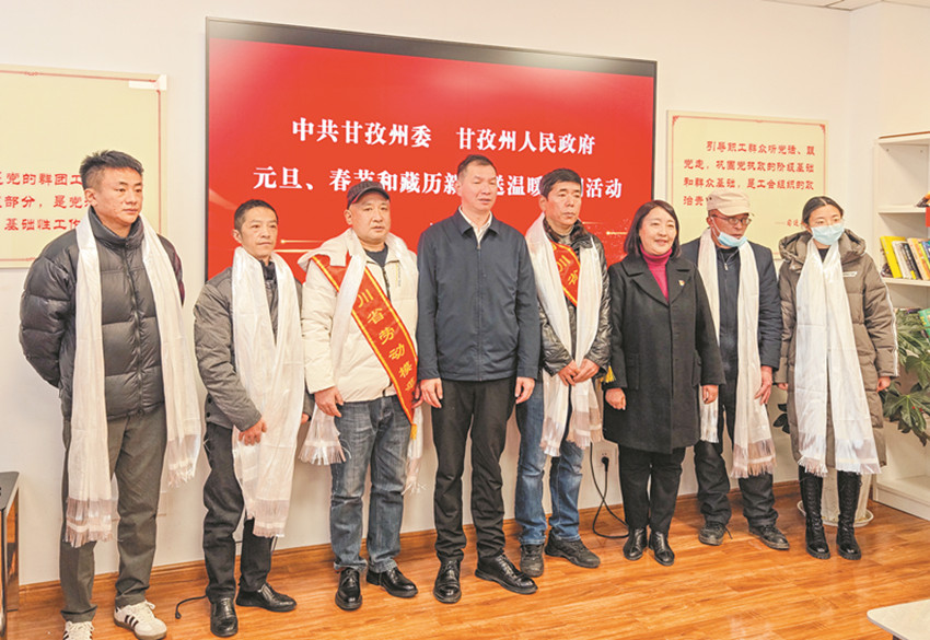 州委常委、統(tǒng)戰(zhàn)部長、州總工會(huì)主席游祥飛( 左四 )慰問勞模和困難職工。