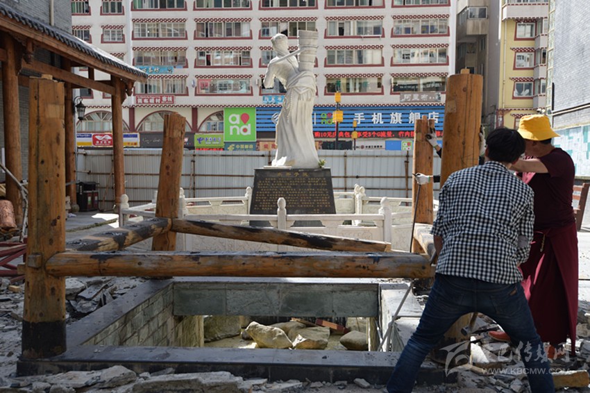 7月5日,夏日艷陽照耀下的康定城中,散步的人們簇?fù)碓谒铀囆g(shù)景觀改造提升施工現(xiàn)場議論紛紛。