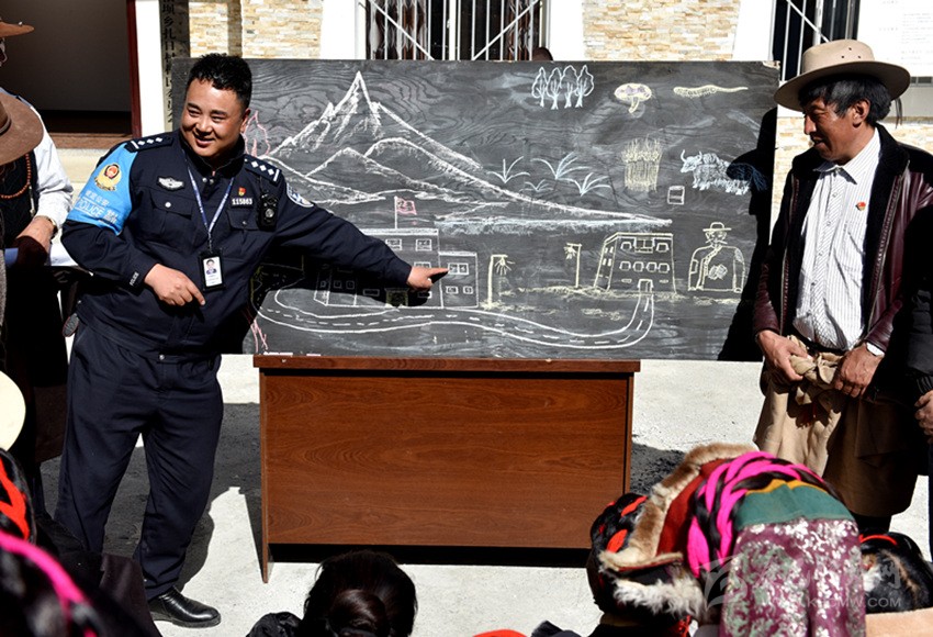 由于轄區(qū)藏族群眾大多都不識(shí)漢字、不會(huì)漢語(yǔ),巴桑呷瓦便將自己的繪畫(huà)技藝運(yùn)用到普法教育中,2018年10月,康定市公安局在對(duì)聯(lián)系鄉(xiāng)甲根壩開(kāi)展精準(zhǔn)扶貧工作時(shí),在全市范圍內(nèi)抽調(diào)了巴桑呷瓦等10名富有群眾工作經(jīng)驗(yàn)的民警,他一邊負(fù)責(zé)沙德鎮(zhèn)派出所日常工作,一邊負(fù)責(zé)兼職扎日村精準(zhǔn)扶貧工作,用繪畫(huà)的方式為牧民群眾描繪脫貧致富夢(mèng)。他把國(guó)家的相關(guān)法律法規(guī)、民族政策和惠民工程政策吃透并制作成故事性強(qiáng)、通俗易通的簡(jiǎn)筆畫(huà)冊(cè)向老百姓解讀、宣講。在巴桑呷瓦妙趣橫生、詼諧幽默的“授課”下,深?yuàn)W的法律政策變得淺顯易懂?!八漠?huà)形象生動(dòng),接地氣,有我們的生產(chǎn)生活場(chǎng)景,我們喜歡看,他的講解幽默風(fēng)趣,我們聽(tīng)得懂,只要他一下來(lái),村民都圍在他的身邊,舍不得離開(kāi)?!痹沾宓拇迕褚呀?jīng)把這位“畫(huà)家”警察當(dāng)作了自家人。