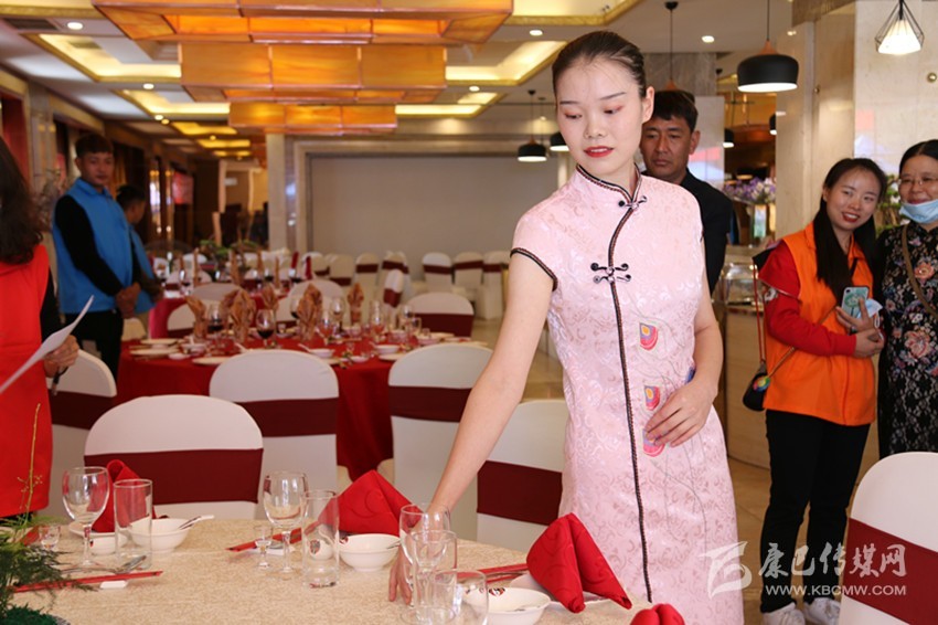 楊輝正在餐廳服務員賽場比賽。